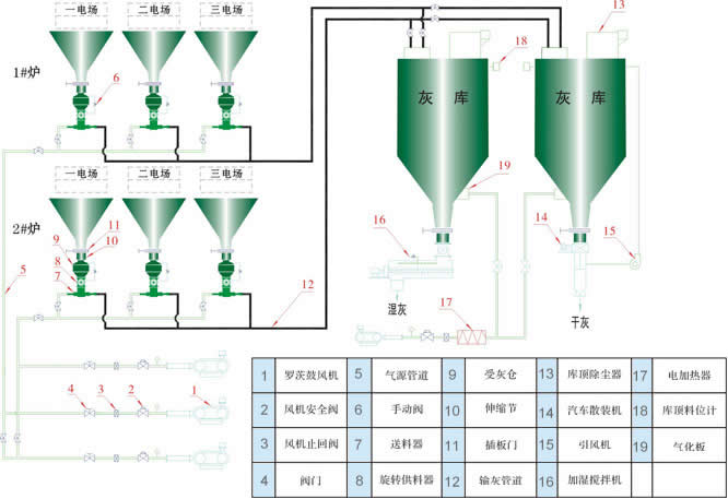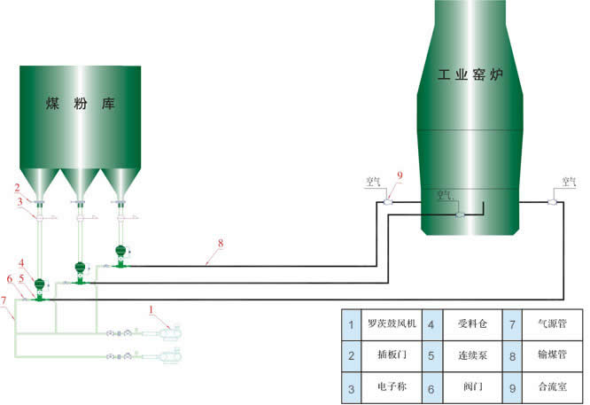 二、原理及特点: 原理: PSG系列气固喷射器,以离心风机(空压机、罗茨风机)为动力气源,运用气固两相流原理,以流态化技术,射流技术和压差原理相结合,以电动旋转供料器为供料装置,将物料送入料气混合室,物料在料气混合室流态化的同时,利用双环状喷嘴产生的高速气流将物料送入加速室,以悬浮流进入输送管道,利用气力压差将物料沿管道送入受料仓内。料气分离,经布袋除尘器过滤后将气体排入大气。 特点: 1、投资省、运行成本低、节能明显 由PSG系列气固喷射器组成的低压连续输送系统,不仅在工程造价上体现其投资省、而且运行成本低。由于无进出料及排气阀门,无易损件,因此运行费用低,同时使用低压输送比空压机系统输送要节约能耗30%左右。 2、操作方便 该设备本体控制只有电动旋转供料器和进气阀,则设备本体控制只需“启动”或“停机”操作,设备运行只需巡视,不需要人工值守。由于连续泵工艺系统简单,所配置的控制系统也相应简单。根据系统配置,既使采用PLC控制系统,如发生故障,具有报警系统,也可手动控制,不影响系统的正常运行。 3、设备及管道磨损小、使用寿命长 由于采用低压输送,设备及输灰管内流速较低,输送浓度恒定。因此,系统设备和管道磨损小、使用寿命长。 4、系统布置方便灵活 由于该设备体积小,安装高度较低,因此在系统布置时方便灵活,可完全满足工程布置需要。 5、对气源的品质要求不高 连续泵动力气源,一般采用离心风机或罗茨风机和压缩机,无需设立空气净化系统。根据系统设计,只对风量和压力有一定的要求。根据情况也可使用压气站气源。 6、系统可靠性高 ①PSG系列气固喷射器采用离心风机或罗茨风机和压缩机为动力气源,由于风机的高性能决定了系统的运行可靠性。 ②PSG系列气固喷射器组成的气力输送系统,在现场灰量允许的条件下,可采用两个灰斗共用一台泵的布置方式,一般设备数量少,使得整个系统简洁可靠。 ③PSG系列气固喷射器料气比稳定,无任何冲击负荷,无常规气力输送工艺中的阀门频繁动作,设备故障率大大降低。 三.、典型系统工艺流程 1、典型工艺流程一