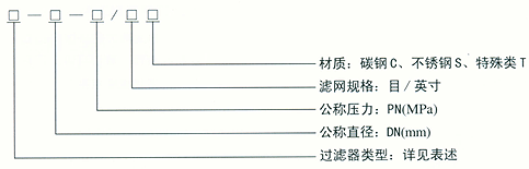 本公司生产的管道过滤器,主要有:1、Y型过滤器  2、T型过滤器  3、篮式过滤器 4、临时过滤器  5、气体过滤器。    其型号标注如下: