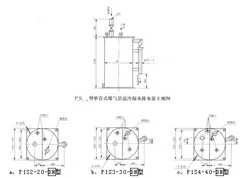 2、示例:煤气管道最大压力为20000Pa,接管规格133×4.5,应选型号:P1S3-30-125,其中“30”为水封高度(mm)